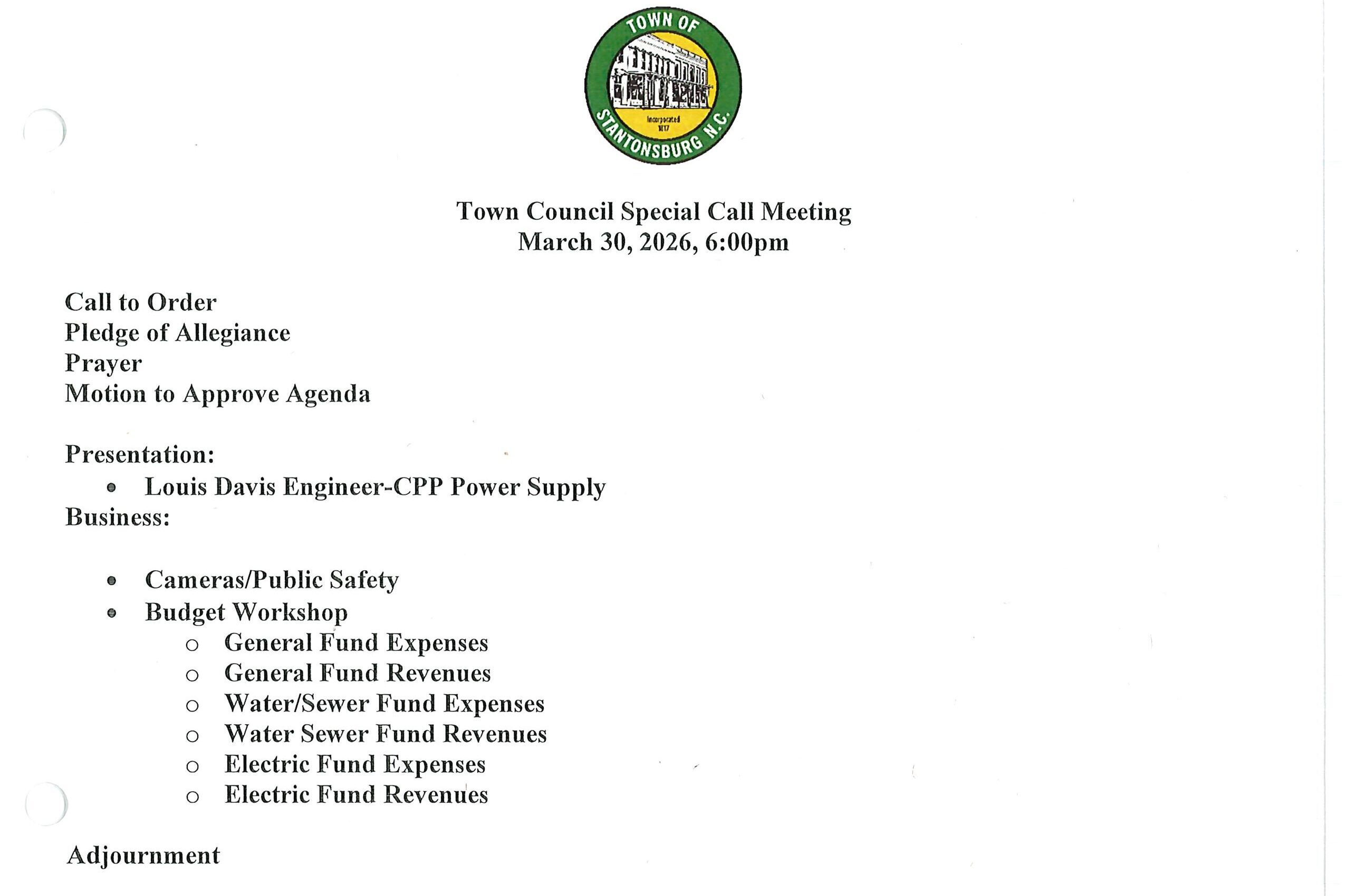 A Special Called Meeting/Budgeting Workshop will be held on March 30, 2026, at 6:00pm in the Town Hall.